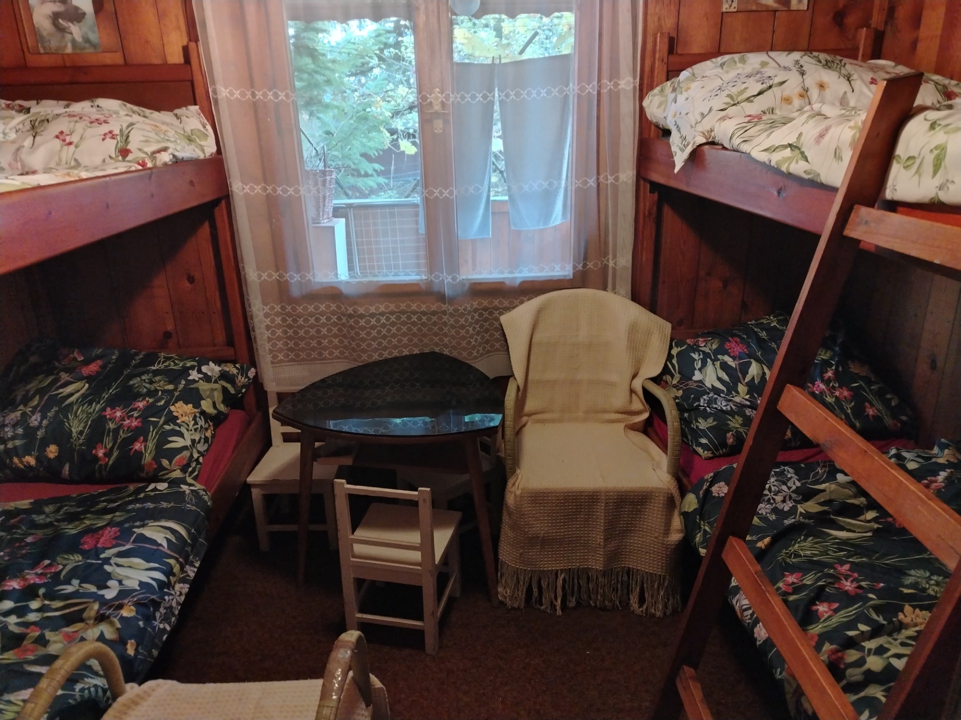 Chata je útulná. Má dva pokoje. Jeden je s krbovými kamny, stolem, dvěmi pohovkami, tv, slouží jako obývací či jídelní. Druhý pokoj je vybaven dvěmi sadami patrových postelí. Samozřejmostí jsou moderní matrace i ložní prádlo. Součástí chaty je i malá kuchyňka, plně vybavená. V letních měsících můžete využít verandu s posezením a výhledem do zahrádky, která je travnatá a můžete pozorovat divoké ptáky, kteří v zahradě rádi řádí. Potkat můžete i ježka, který u nás zimuje v kompostu a v létě si své teritorium hlídá.